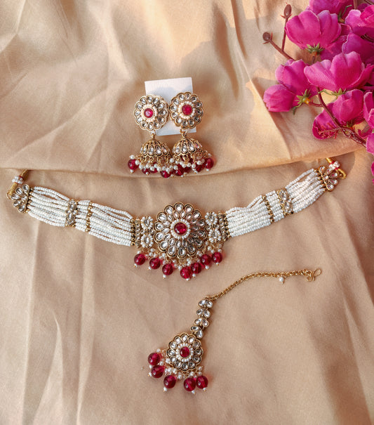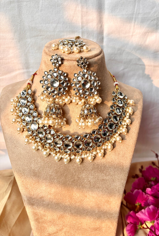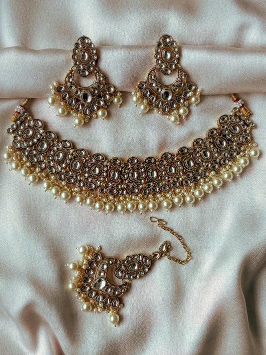 Eva Kundan Pearl Choker with Earrings & Tika