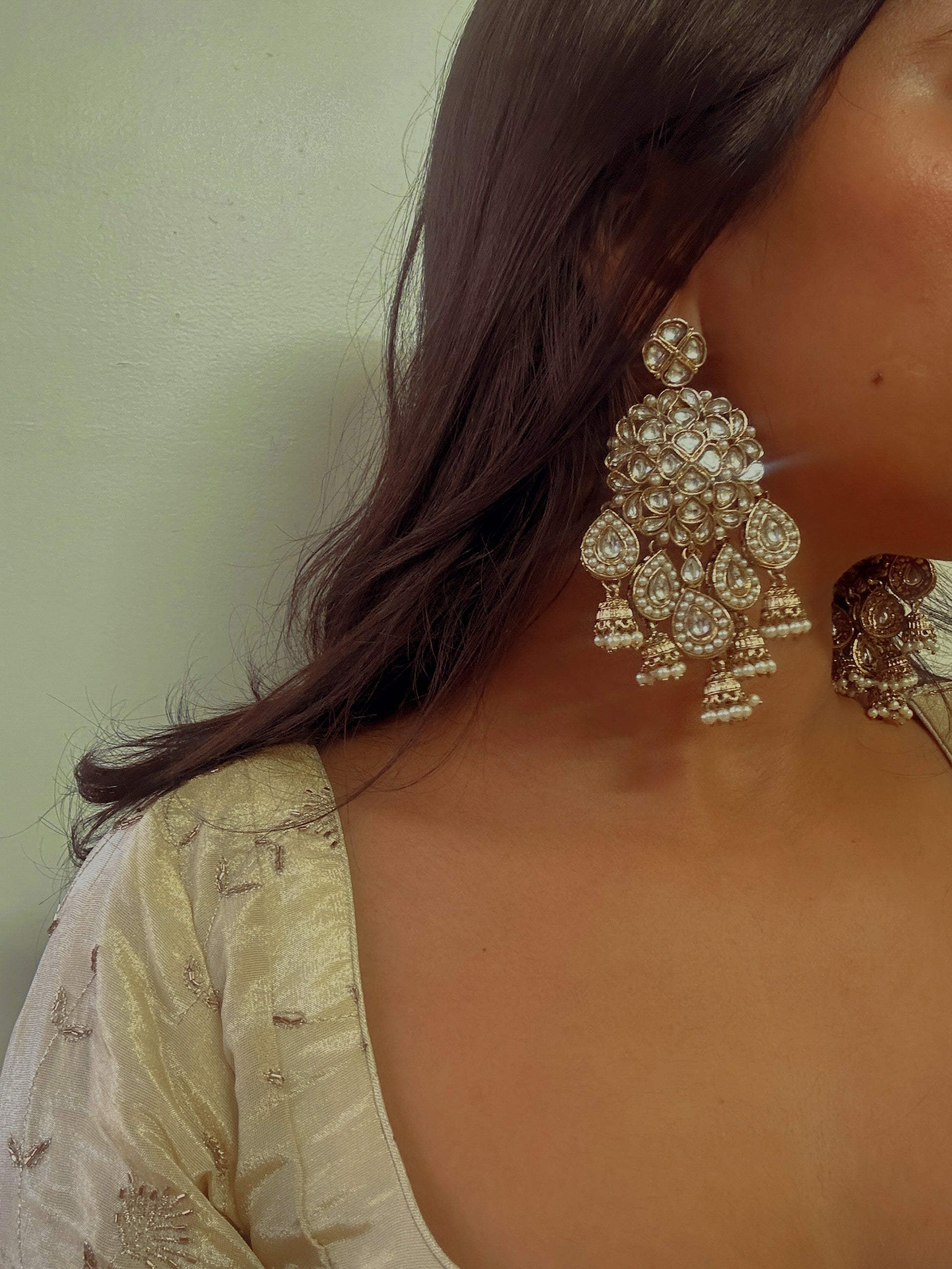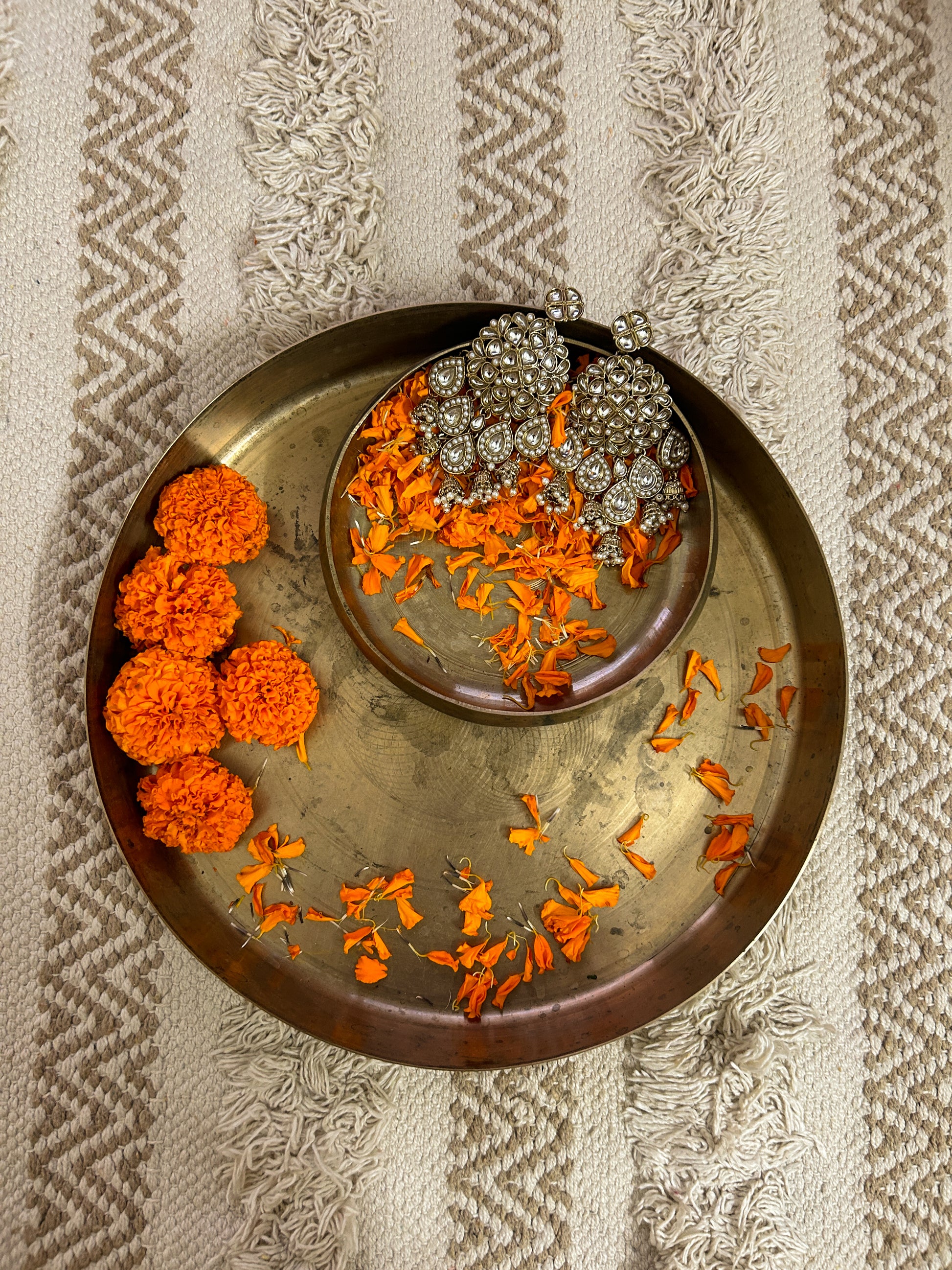 These long Kundan statement earrings are crafted in high-quality materials that mirror the elegance of heirloom jewelry—minus the weight or price tag. The hand-set Kundan stones glimmer against a rich antique finish, designed to catch the light (and compliments) from every angle.