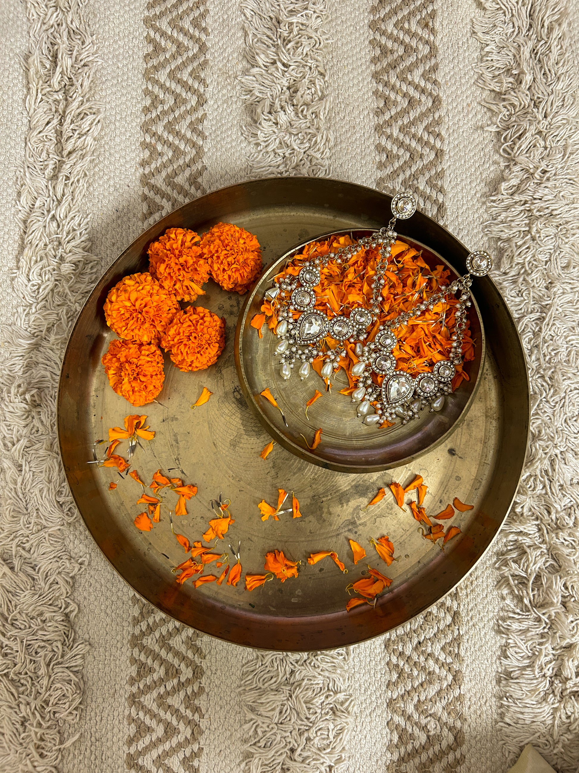 These long Kundan statement earrings are crafted in high-quality materials that mirror the elegance of heirloom jewelry—minus the weight or price tag. The hand-set Kundan stones glimmer against a rich antique finish, designed to catch the light (and compliments) from every angle.